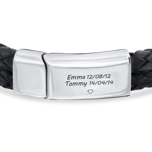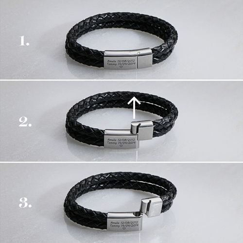 Engraved Bracelet for Men in Stainless Steel and Black Leather